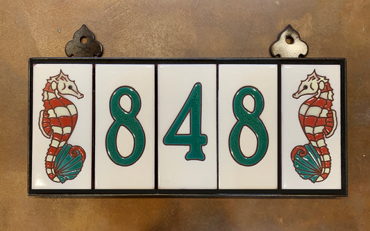 Custom Tile House Numbers with Seahorse End Caps, Off White Background and Jade Numbers