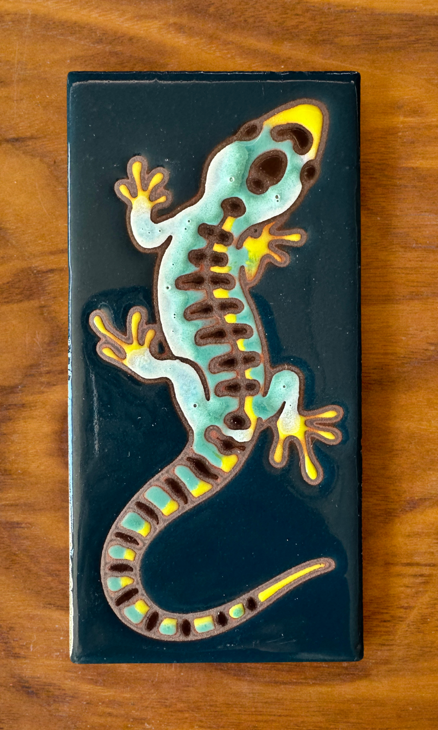 3”x6” Hand Glazed Gecko Tile, available in Dark Turquoise, Silver, and Terra Cotta backgrounds.
