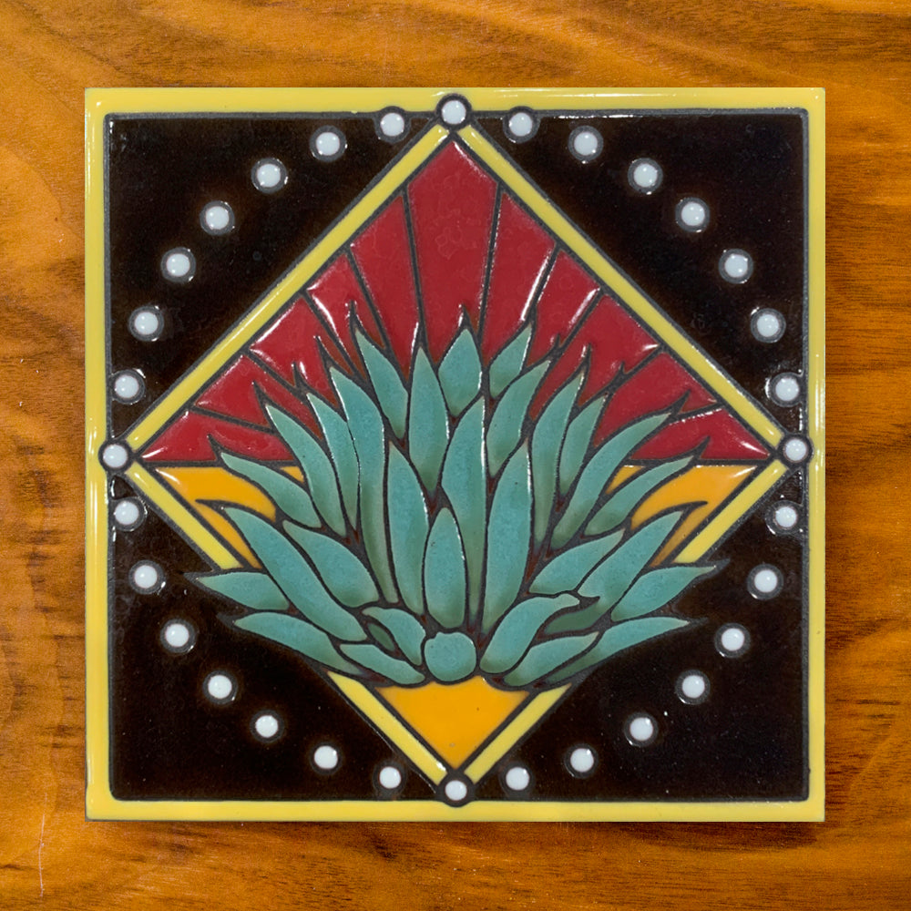 6”x6” Agave tile design. Great for use as coasters or decorative art pieces. All tiles come cork backed so they will not scratch your tables. A hole has been provided at the top of the backing for easy hanging. Each tile is hand glazed, no two are alike and glaze variations are to be expected.