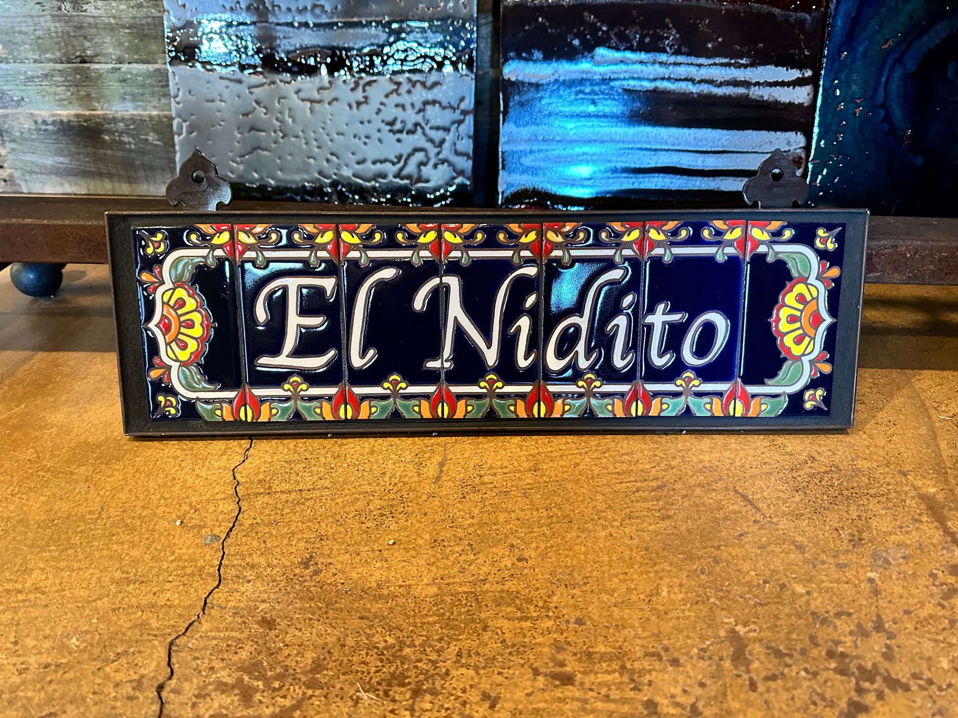 Custom House Sign with Talavera End Caps, Dark Blue Background, and White Letters