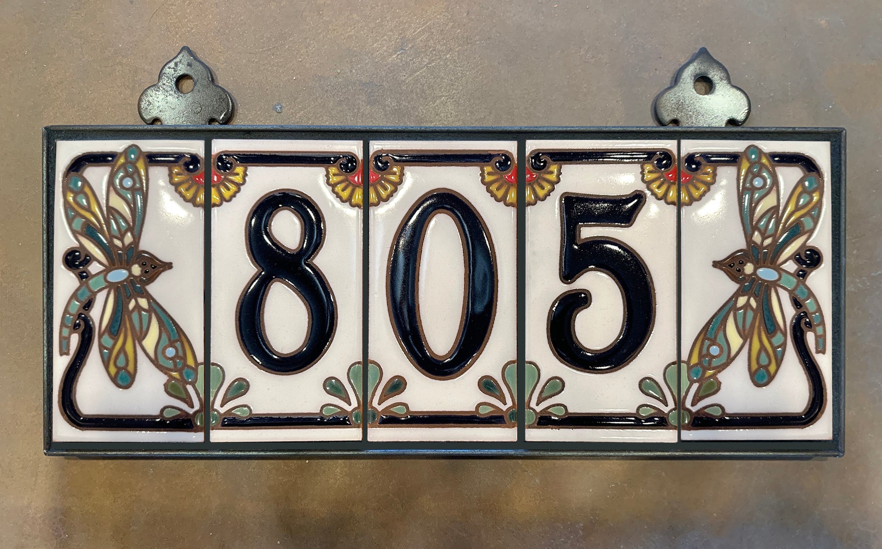 Custom Tile House Numbers with Dragonfly End Caps, White Ceramic Background, and Blue Numbers