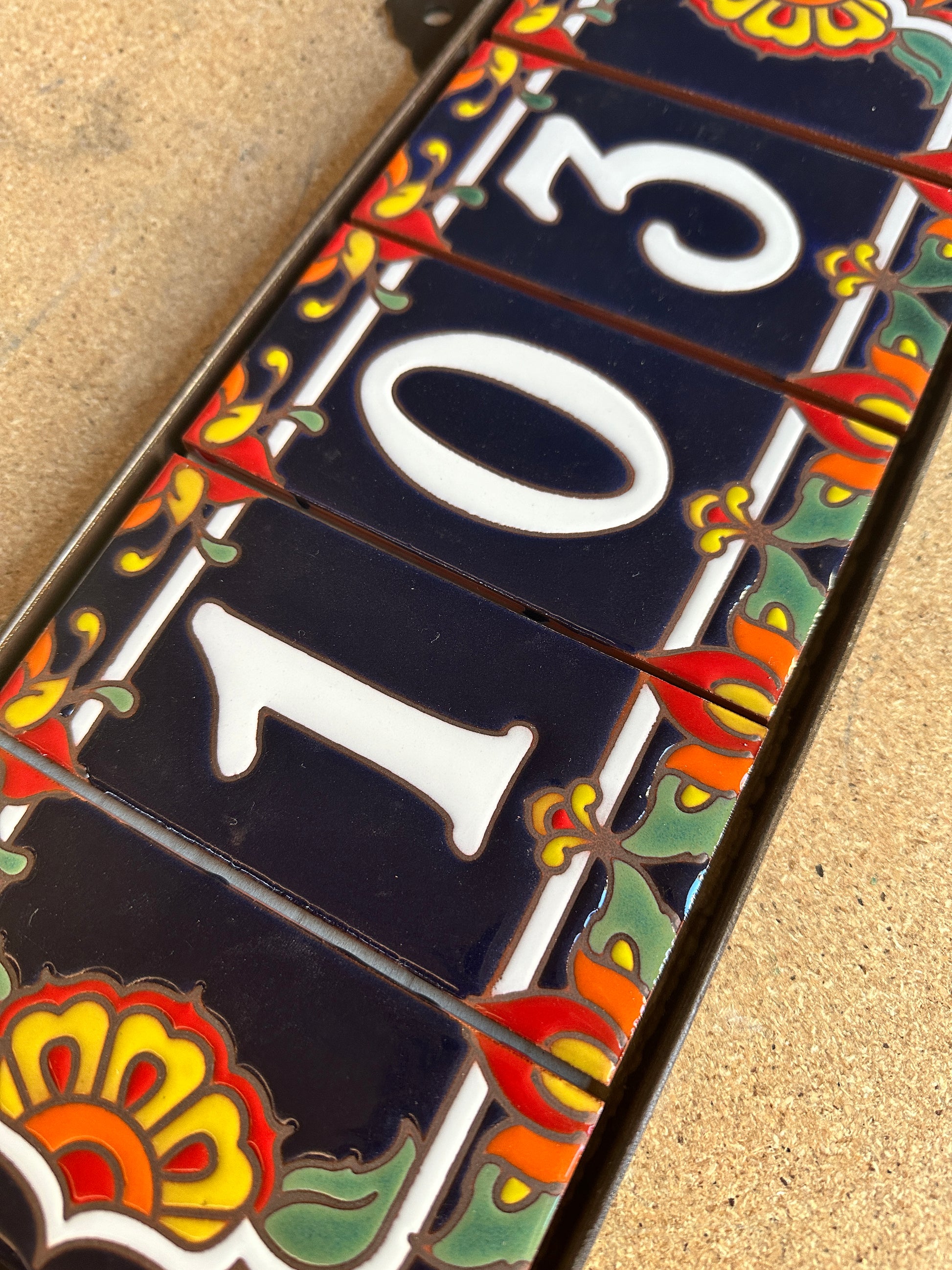 A custom address sign made from our 3"x6" tile house numbers, set and grouted in a hand-welded metal frame. This talavera style design features dark blue ceramic background and white numbers with colorful Talavera end caps. Each address sign is ready to hang and made to last.