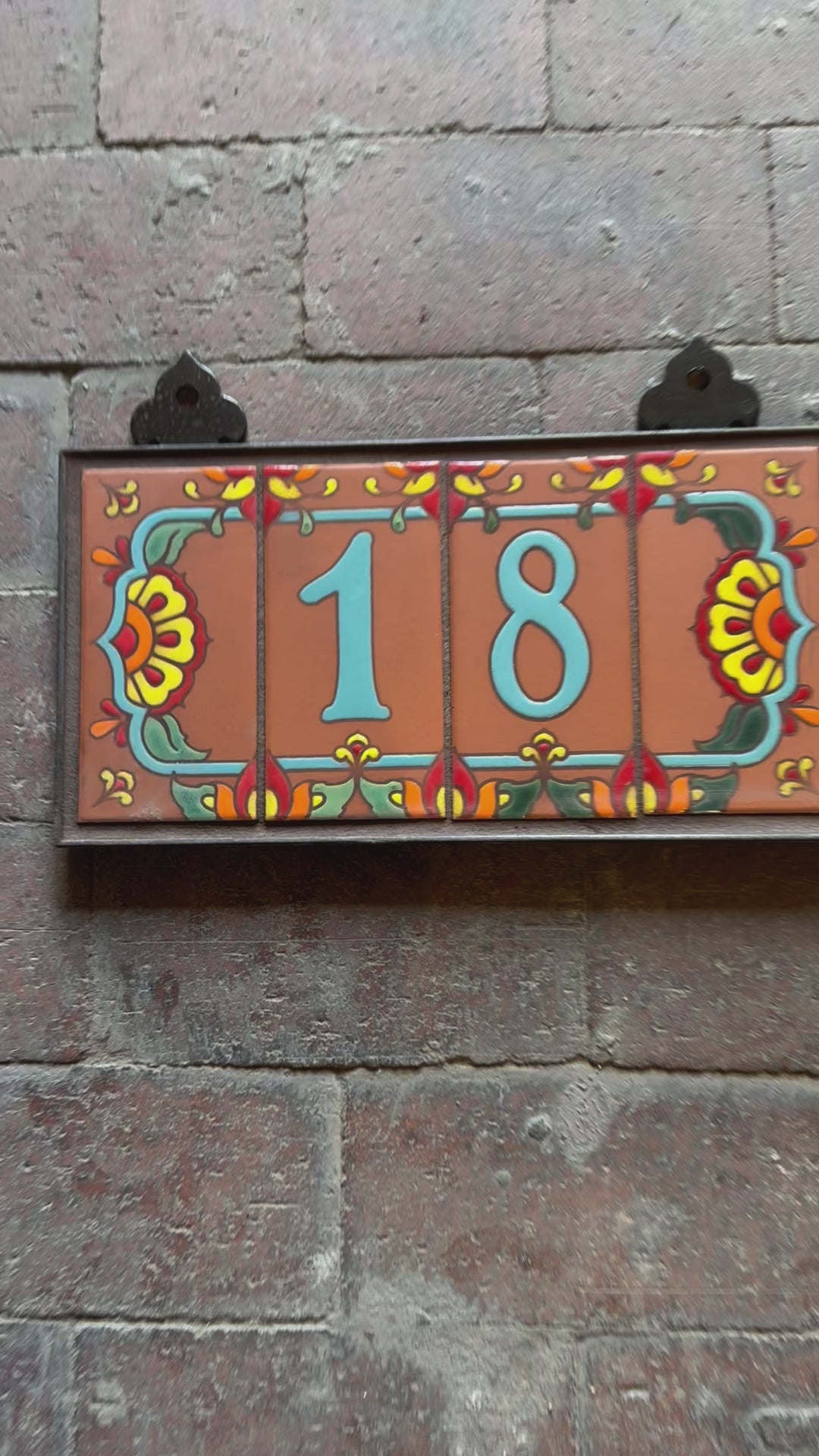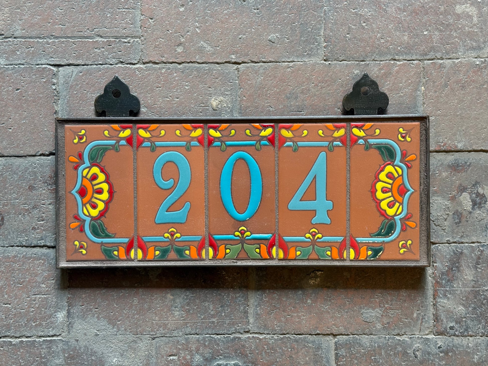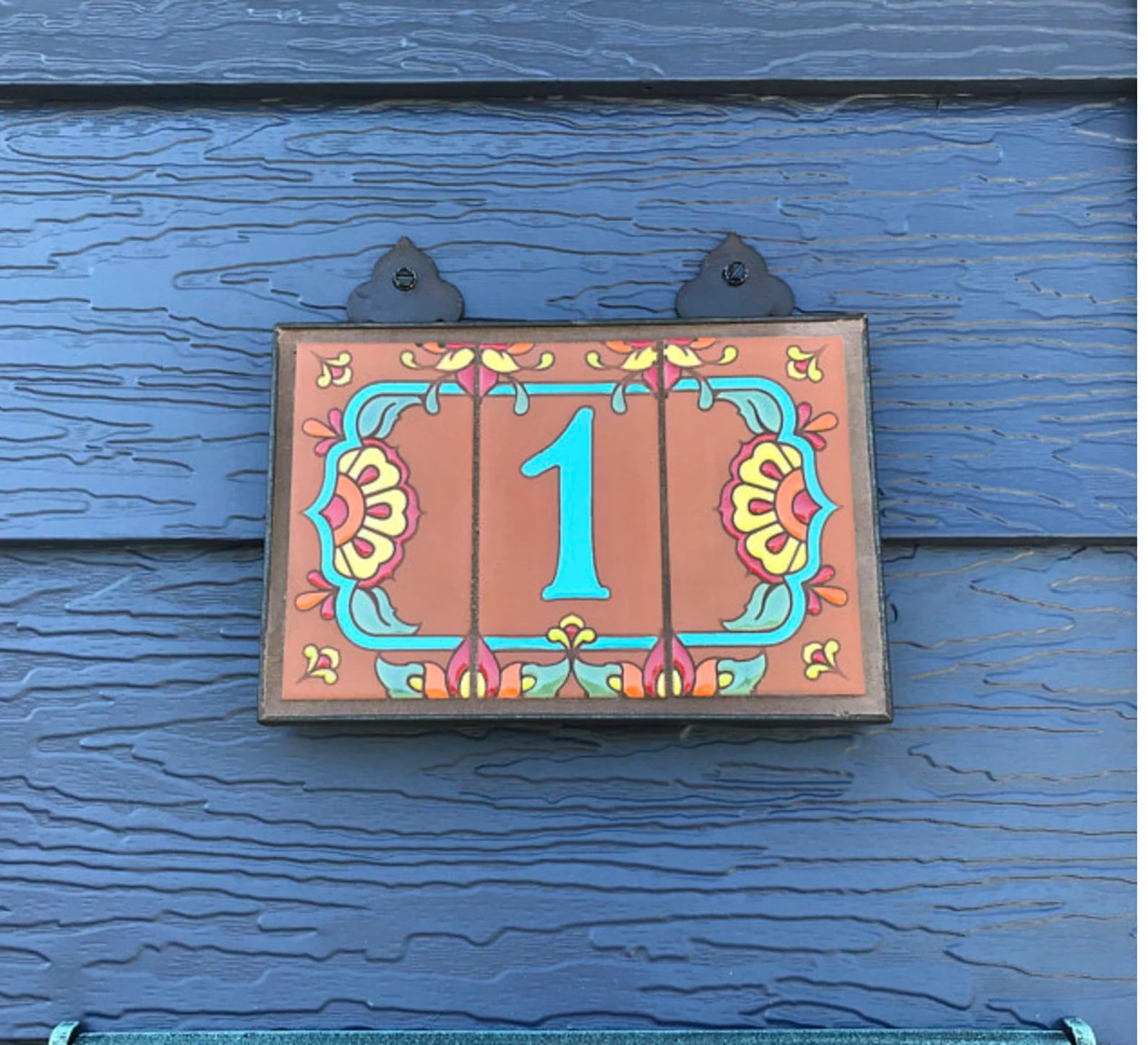 Custom Tile House Numbers with Talavera End Caps, Terra Cotta Background, and Turquoise Numbers