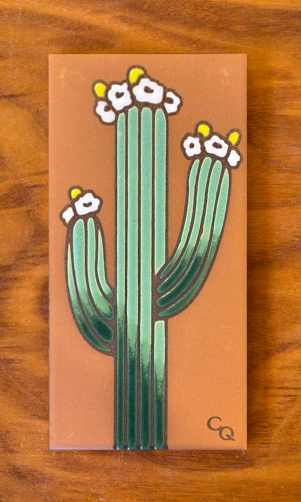 3”x6” Hand Glazed Saguaro Tile. The background is left unglazed to let the matte Terra Cotta show through. Great to buy in pairs for use as Casserole trivets or as a decorative piece. All tiles come cork backed so they will not scratch your tables. A hole has been provided at the top of the backing for easy hanging. Each tile is hand glazed, no two are alike and glaze variations are to be expected.