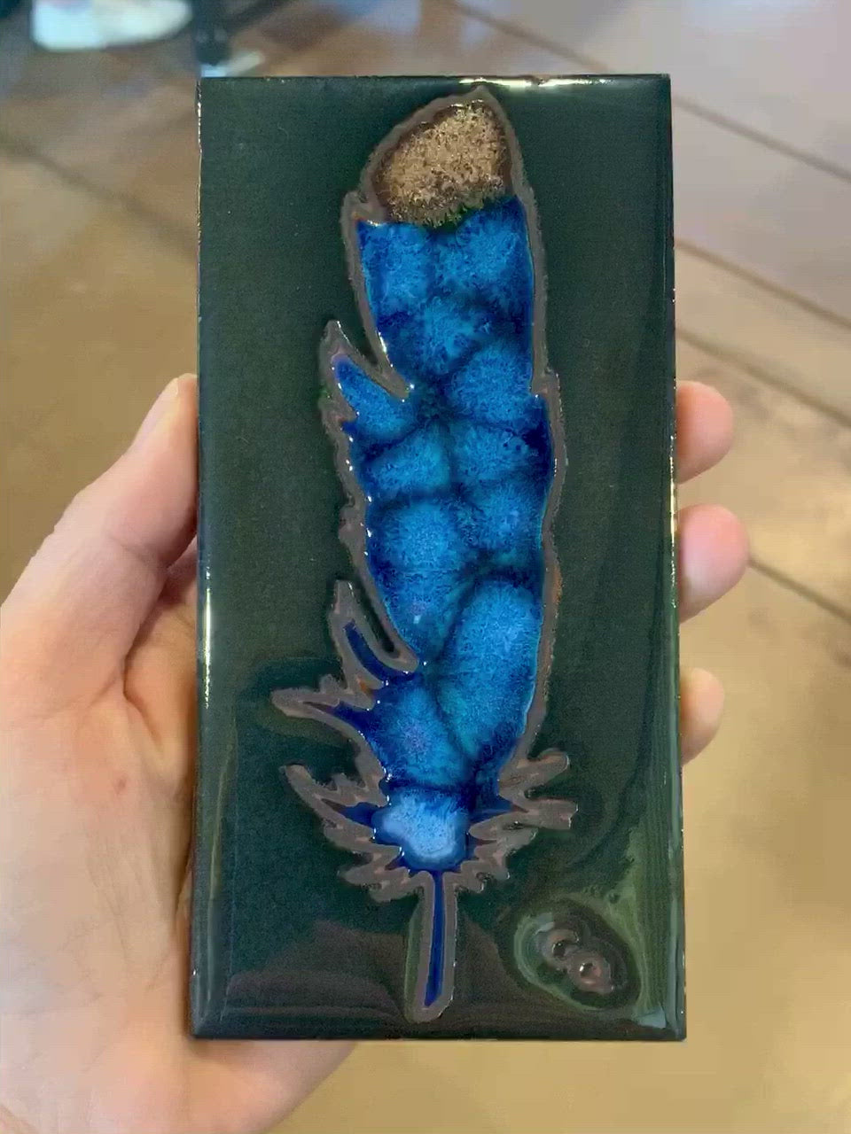 3”x6” Hand Painted Watercolor Feather on Silver. No two pieces are alike. Using a proprietary technique developed over the years, we are able to achieve a Watercolor like effect with these unique pieces. The background is left unglazed to let the matte Terra Cotta show through. All tiles come cork backed so they will not scratch your tables. A hole has been provided at the top of the backing for easy hanging. Each tile is hand glazed, no two are alike and glaze variations are to be expected.